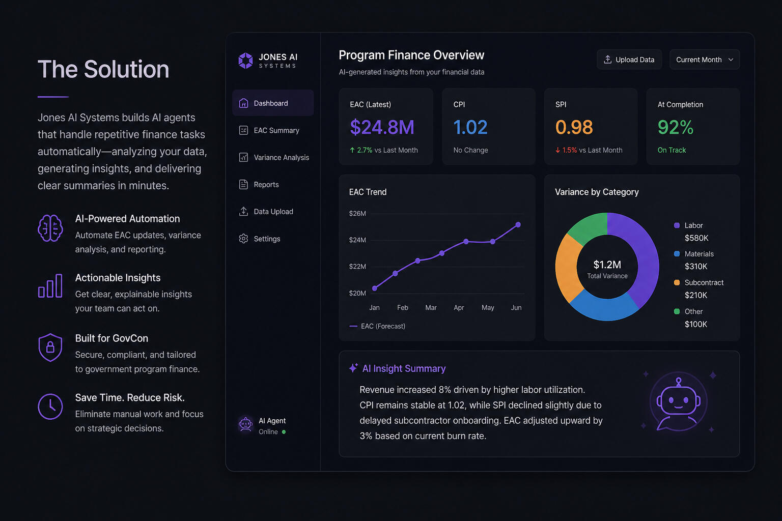 Program finance teams spend hours every week manually updating spreadsheets, analyzing variances, and preparing reports. This slows decision-making and introduces risk.